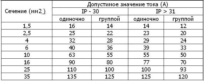 На сечение кабеля в щите большое воздействие оказывают такие вопросы, как температура возле жил и максимально допустимое значение тока, проходящего через него. Специалисты рекомендуют использоваться сечение провода из меди при температуре в 35 градусов для всех щитов, вне зависимости от степени защиты от попадания грязи и воды.