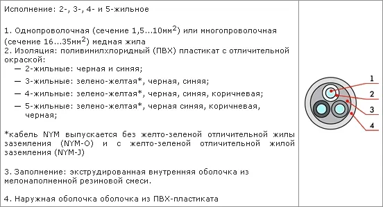 Силовой кабель NYM по праву считается одним из самых устойчивых к распространению пламени. Это достижение стало возможным благодаря наличию негорючих пластикатовых оболочек и изоляции.